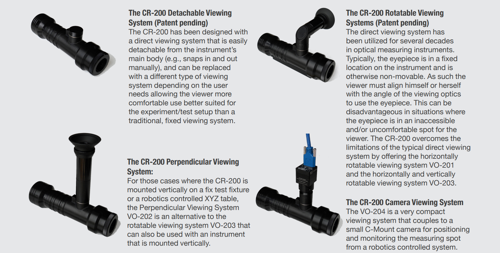Ruggedly constructed, the CR-200 housing is machined aluminium and stainless steel, and can withstand high acceleration rates for the most demanding motion positioning systems and environments. All optical components are fixed to ensure that no optical misalignments occur due to vibration, shock or high acceleration/ deceleration rates. The CR-200 is completely solid-state with no mechanical shutter or moving parts to ensure high reliability and long MTBF. It weighs only 1 pound (0.45 kg), and it is the perfect tool for display inspection or for mounting on fast moving XYZ tables. Its small size and shape allows for several instruments to be mounted in the same motion control system and the simultaneous measurement of several spots in the same display.